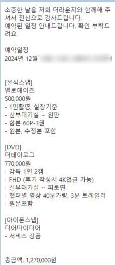 홈페이지에는 스냅과 DVD 모두 있었는데 카톡 문의 시 스냅 촬영만 진행한다고 하셨다.